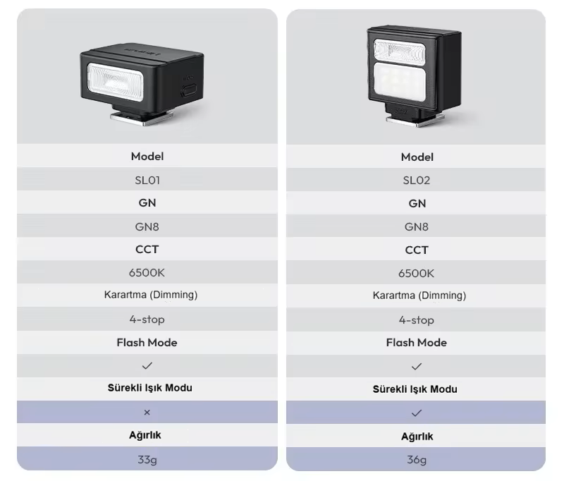 - Evrensel Uyumluluk – Tek pimli sıcak ayakkabı (hot shoe) aracılığıyla kameralara monte edilir.